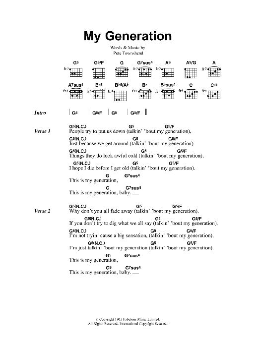 Download or print Oasis My Generation sheet music, chords and digital score arranged for Guitar Chords/Lyrics. This Rock score includes 2 page(s).