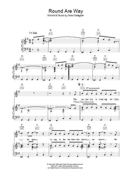 Download or print Oasis Round Are Way sheet music, chords and digital score arranged for Guitar Chords/Lyrics. This Rock score includes 2 page(s).
