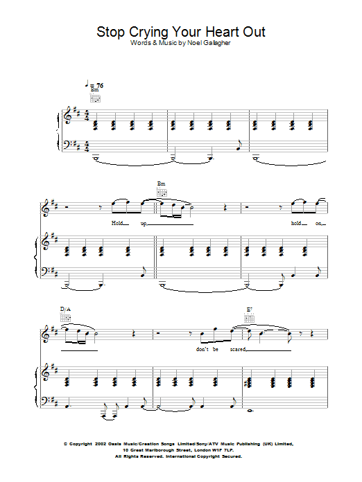 Download or print Oasis Stop Crying Your Heart Out sheet music, chords and digital score arranged for Guitar Chords/Lyrics. This Rock score includes 3 page(s).