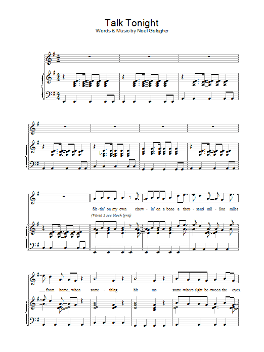 Download or print Oasis Talk Tonight sheet music, chords and digital score arranged for Piano, Vocal & Guitar Chords. This Rock score includes 4 page(s).
