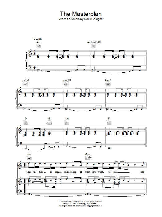 Download or print Oasis The Masterplan sheet music, chords and digital score arranged for Guitar Chords/Lyrics. This Rock score includes 2 page(s).