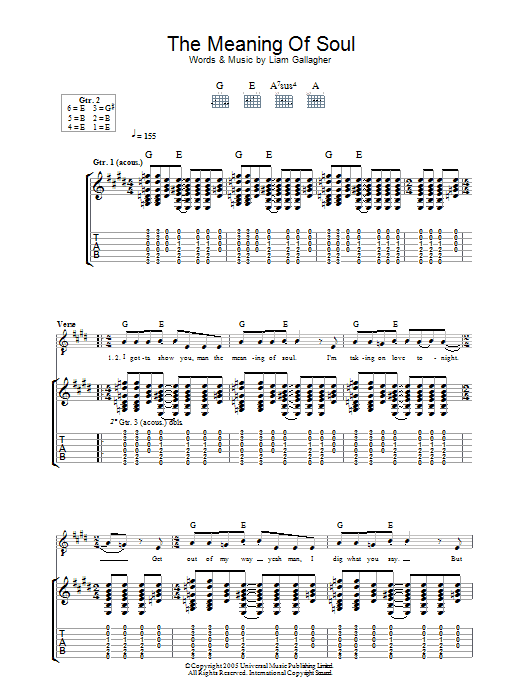 Download or print Oasis The Meaning Of Soul sheet music, chords and digital score arranged for Piano, Vocal & Guitar Chords. This Rock score includes 4 page(s).