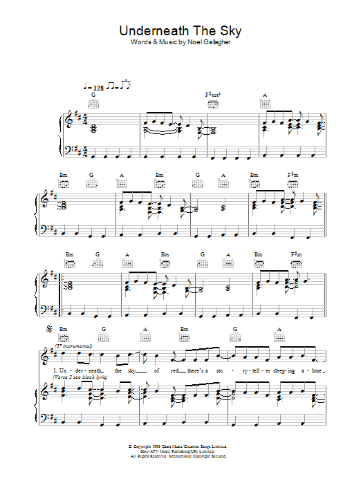 Download or print Oasis Underneath The Sky sheet music, chords and digital score arranged for Guitar Chords/Lyrics. This Rock score includes 2 page(s).