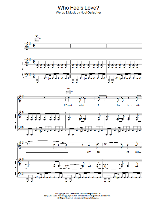 Download or print Oasis Who Feels Love? sheet music, chords and digital score arranged for Guitar Chords/Lyrics. This Rock score includes 2 page(s).