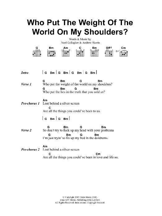 Download or print Oasis Who Put The Weight Of The World On My Shoulders? sheet music, chords and digital score arranged for Guitar Chords/Lyrics. This Rock score includes 2 page(s).
