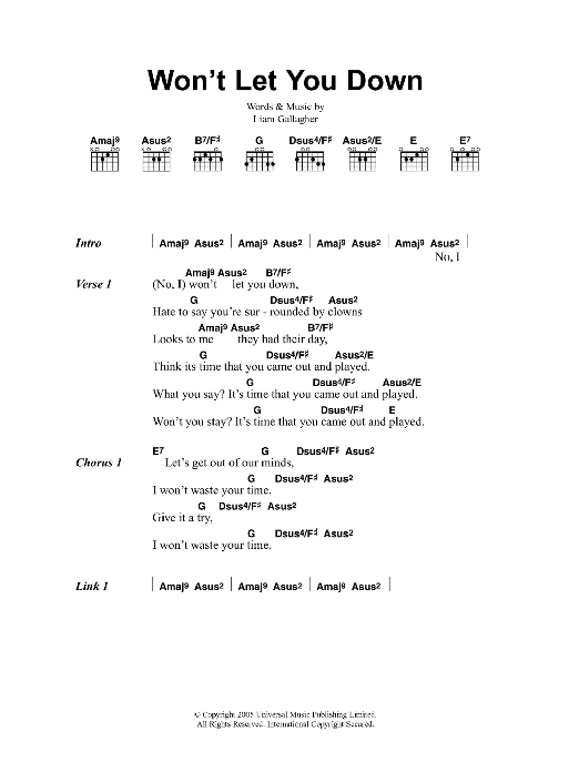 Download or print Oasis Won't Let You Down sheet music, chords and digital score arranged for Guitar Chords/Lyrics. This Rock score includes 2 page(s).
