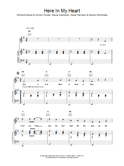 Download or print Ocean Colour Scene Here In My Heart sheet music, chords and digital score arranged for Piano, Vocal & Guitar Chords. This Rock score includes 4 page(s).