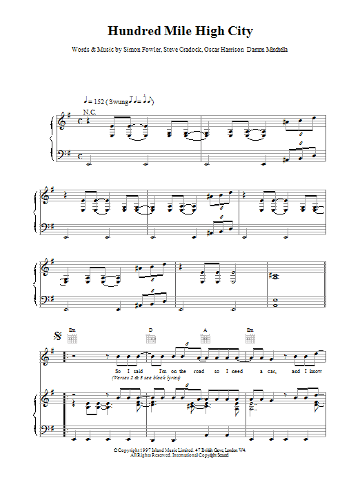 Download or print Ocean Colour Scene Hundred Mile High City sheet music, chords and digital score arranged for Piano, Vocal & Guitar Chords. This Rock score includes 6 page(s).