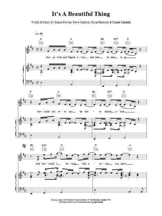 Download or print Ocean Colour Scene It's A Beautiful Thing sheet music, chords and digital score arranged for Piano, Vocal & Guitar Chords. This Rock score includes 4 page(s).