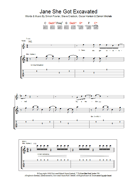 Download or print Ocean Colour Scene Jane She Got Excavated sheet music, chords and digital score arranged for Guitar Tab. This Rock score includes 7 page(s).