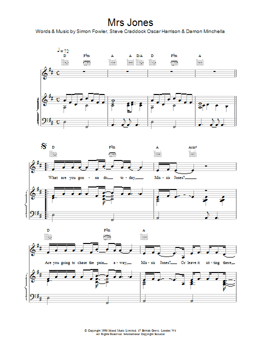 Download or print Ocean Colour Scene Mrs Jones sheet music, chords and digital score arranged for Piano, Vocal & Guitar Chords. This Rock score includes 3 page(s).