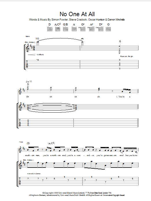 Download or print Ocean Colour Scene No One At All sheet music, chords and digital score arranged for Guitar Tab. This Rock score includes 8 page(s).