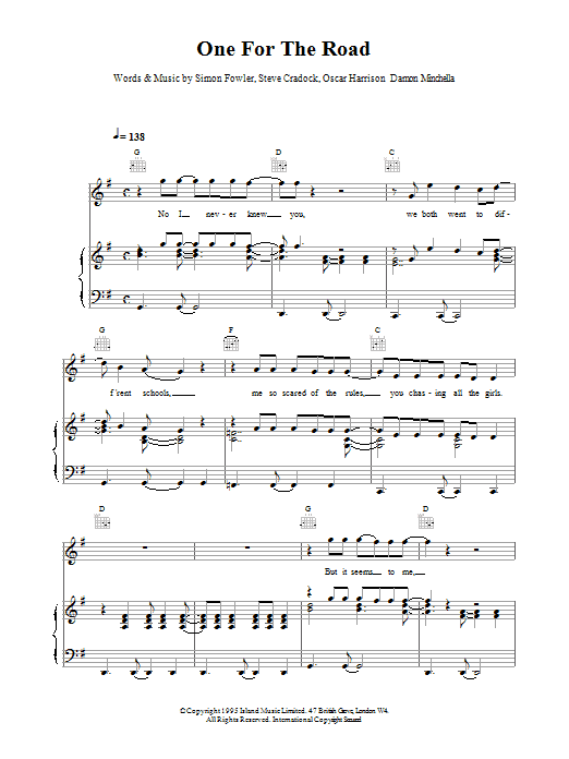 Download or print Ocean Colour Scene One For The Road sheet music, chords and digital score arranged for Piano, Vocal & Guitar Chords. This Rock score includes 4 page(s).