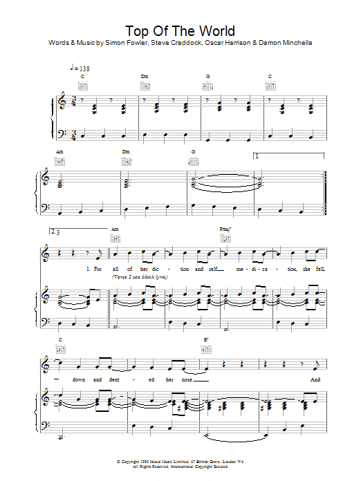 Download or print Ocean Colour Scene Top Of The World sheet music, chords and digital score arranged for Piano, Vocal & Guitar Chords. This Rock score includes 5 page(s).