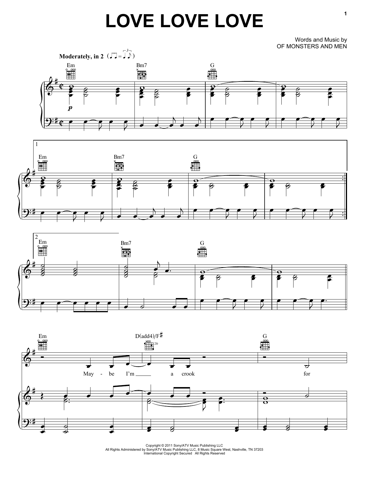 Download or print Of Monsters And Men Love Love Love sheet music, chords and digital score arranged for Piano, Vocal & Guitar Chords (Right-Hand Melody). This Pop score includes 8 page(s).
