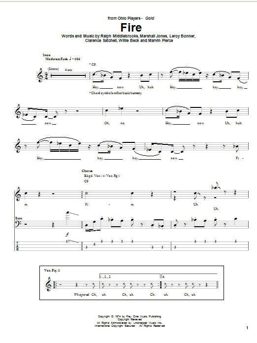 Download or print Ohio Players Fire sheet music, chords and digital score arranged for Piano, Vocal & Guitar Chords (Right-Hand Melody). This Disco score includes 6 page(s).