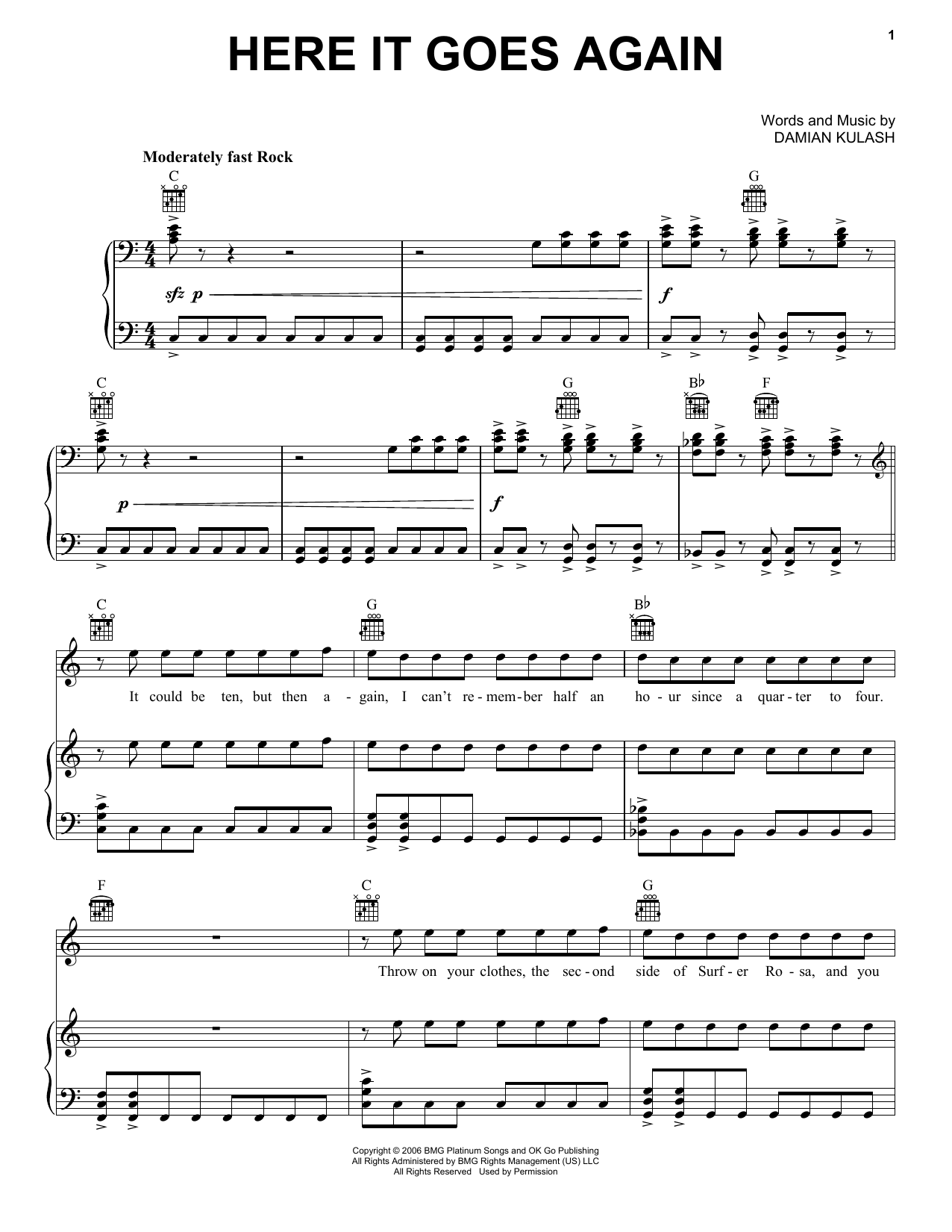 Download or print OK Go Here It Goes Again sheet music, chords and digital score arranged for Piano, Vocal & Guitar Chords (Right-Hand Melody). This Pop score includes 7 page(s).