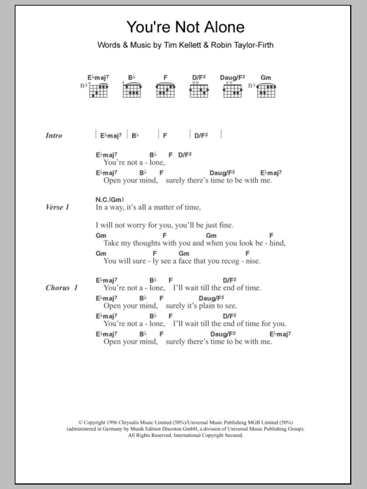 Download or print Olive You're Not Alone sheet music, chords and digital score arranged for Guitar Chords/Lyrics. This Pop score includes 2 page(s).