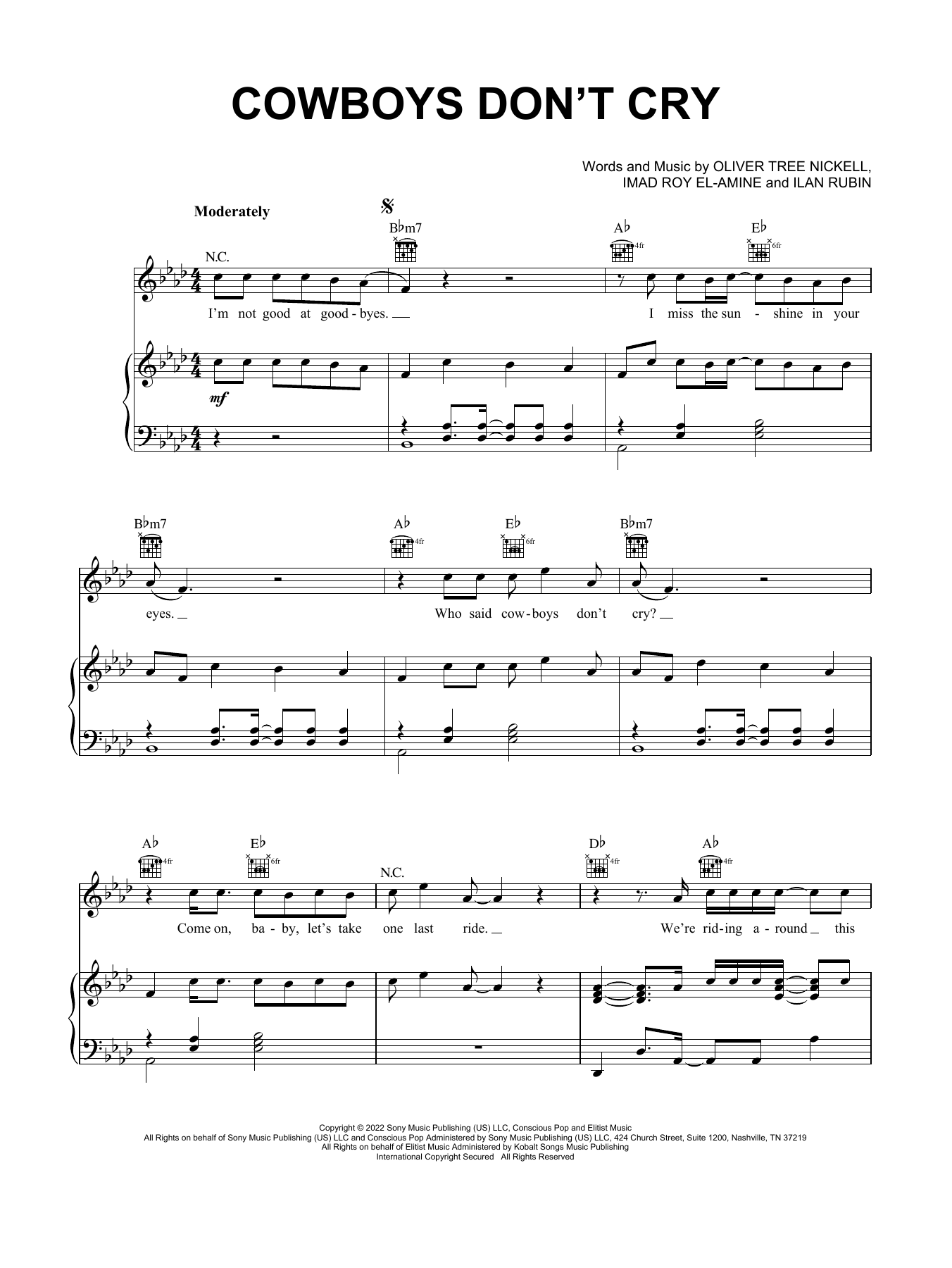 Download or print Oliver Tree Cowboys Don't Cry sheet music, chords and digital score arranged for Piano, Vocal & Guitar Chords (Right-Hand Melody). This Pop score includes 5 page(s).
