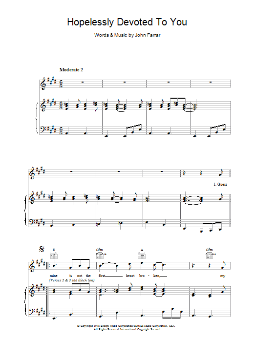 Download or print Olivia Newton-John Hopelessly Devoted To You sheet music, chords and digital score arranged for Easy Lead Sheet / Fake Book. This Love score includes 2 page(s).