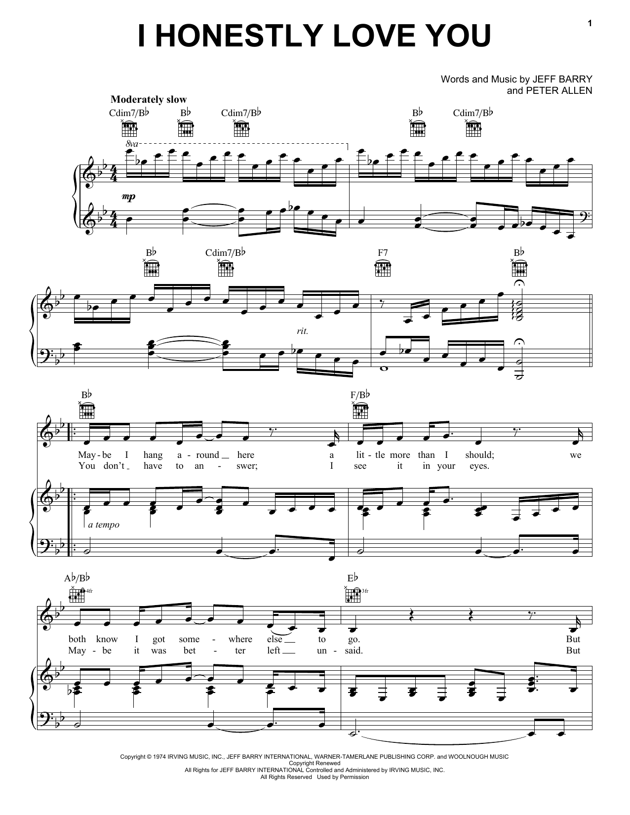 Download or print Olivia Newton-John I Honestly Love You (from The Boy From Oz) sheet music, chords and digital score arranged for Piano, Vocal & Guitar Chords (Right-Hand Melody). This Love score includes 5 page(s).
