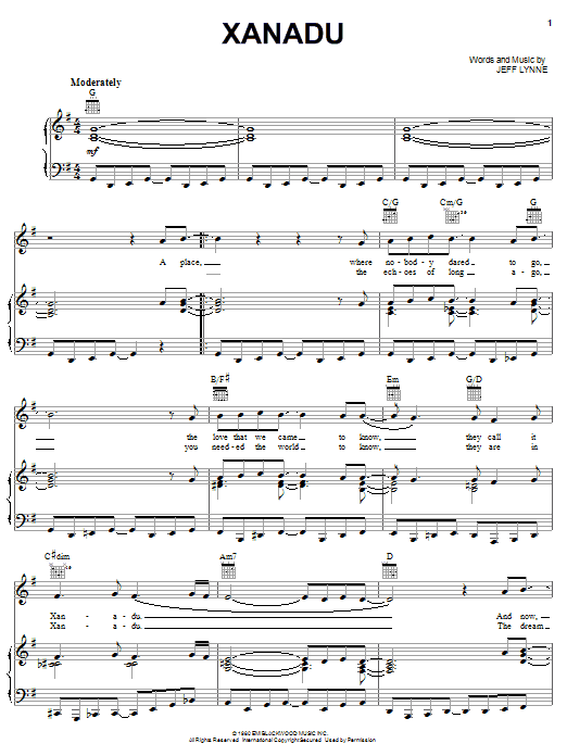 Download or print Olivia Newton-John Xanadu sheet music, chords and digital score arranged for Piano, Vocal & Guitar Chords (Right-Hand Melody). This Film/TV score includes 5 page(s).