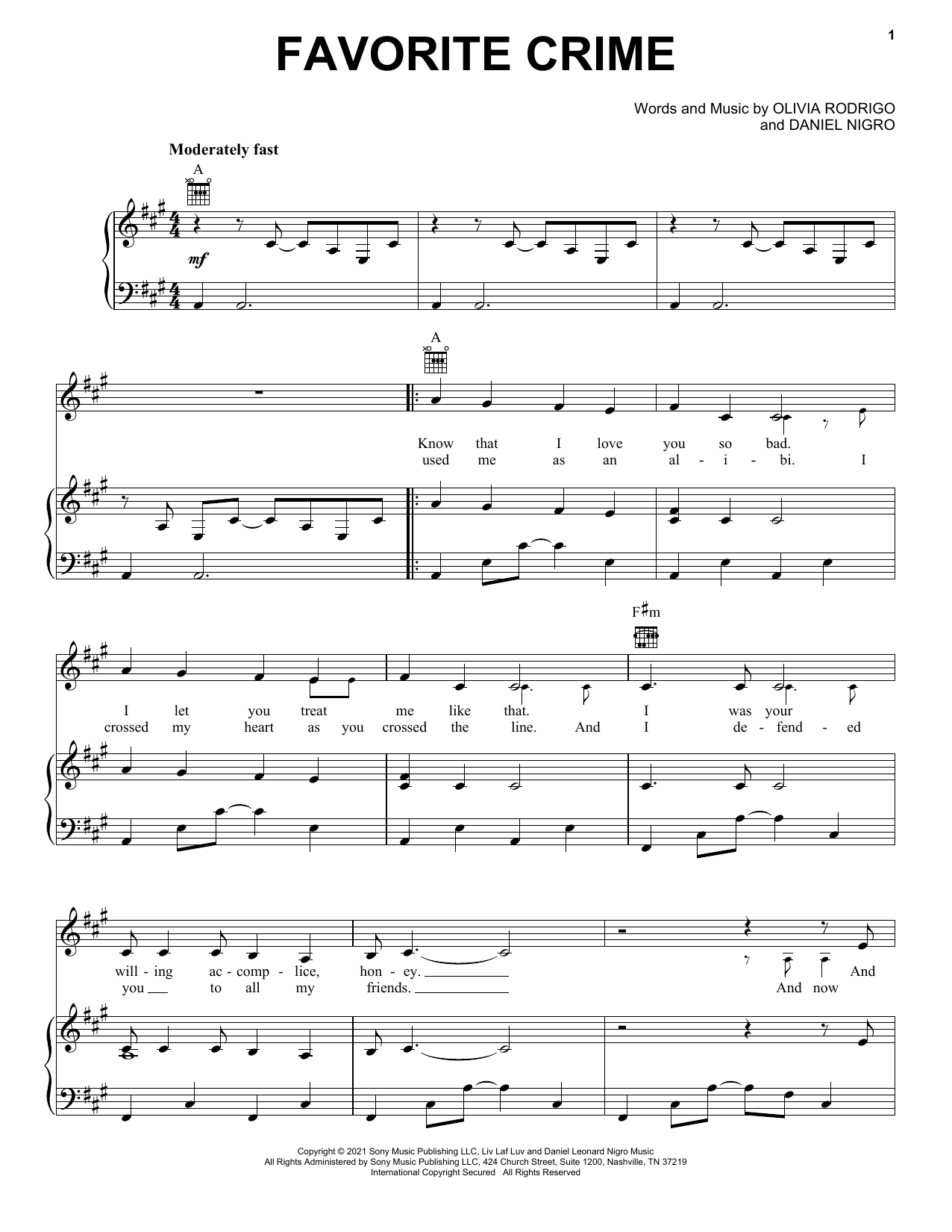 Download or print Olivia Rodrigo favorite crime sheet music, chords and digital score arranged for Piano, Vocal & Guitar Chords (Right-Hand Melody). This Pop score includes 6 page(s).