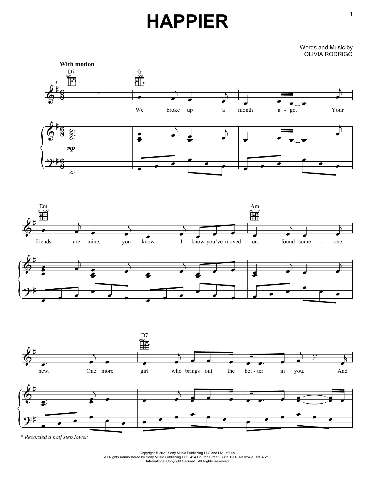 Download or print Olivia Rodrigo happier sheet music, chords and digital score arranged for Piano, Vocal & Guitar Chords (Right-Hand Melody). This Pop score includes 7 page(s).