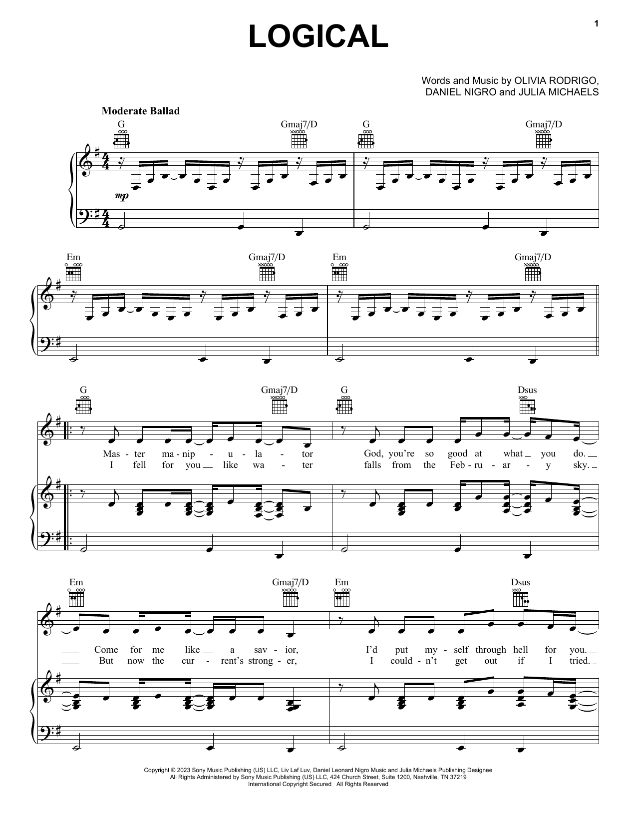 Download or print Olivia Rodrigo logical sheet music, chords and digital score arranged for Piano, Vocal & Guitar Chords (Right-Hand Melody). This Pop score includes 8 page(s).