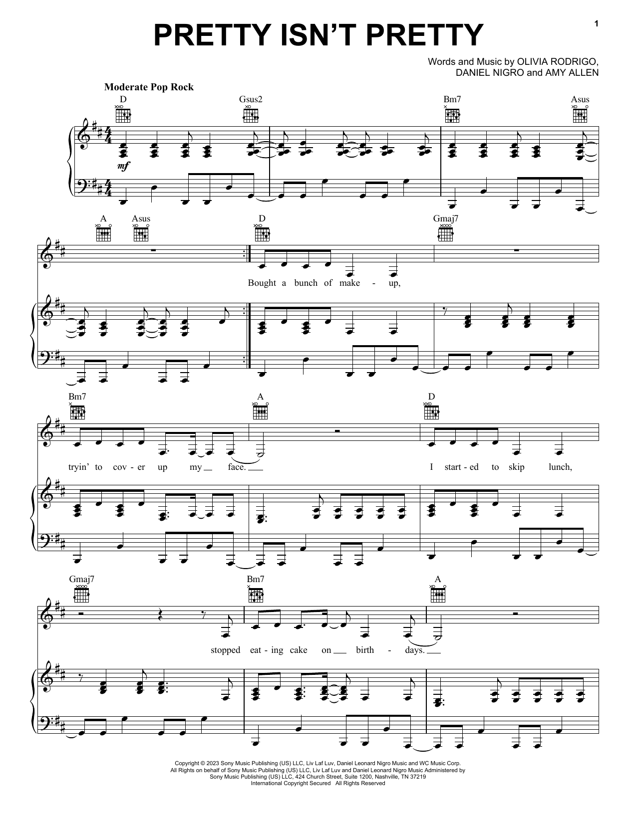 Download or print Olivia Rodrigo pretty isn't pretty sheet music, chords and digital score arranged for Piano, Vocal & Guitar Chords (Right-Hand Melody). This Pop score includes 8 page(s).