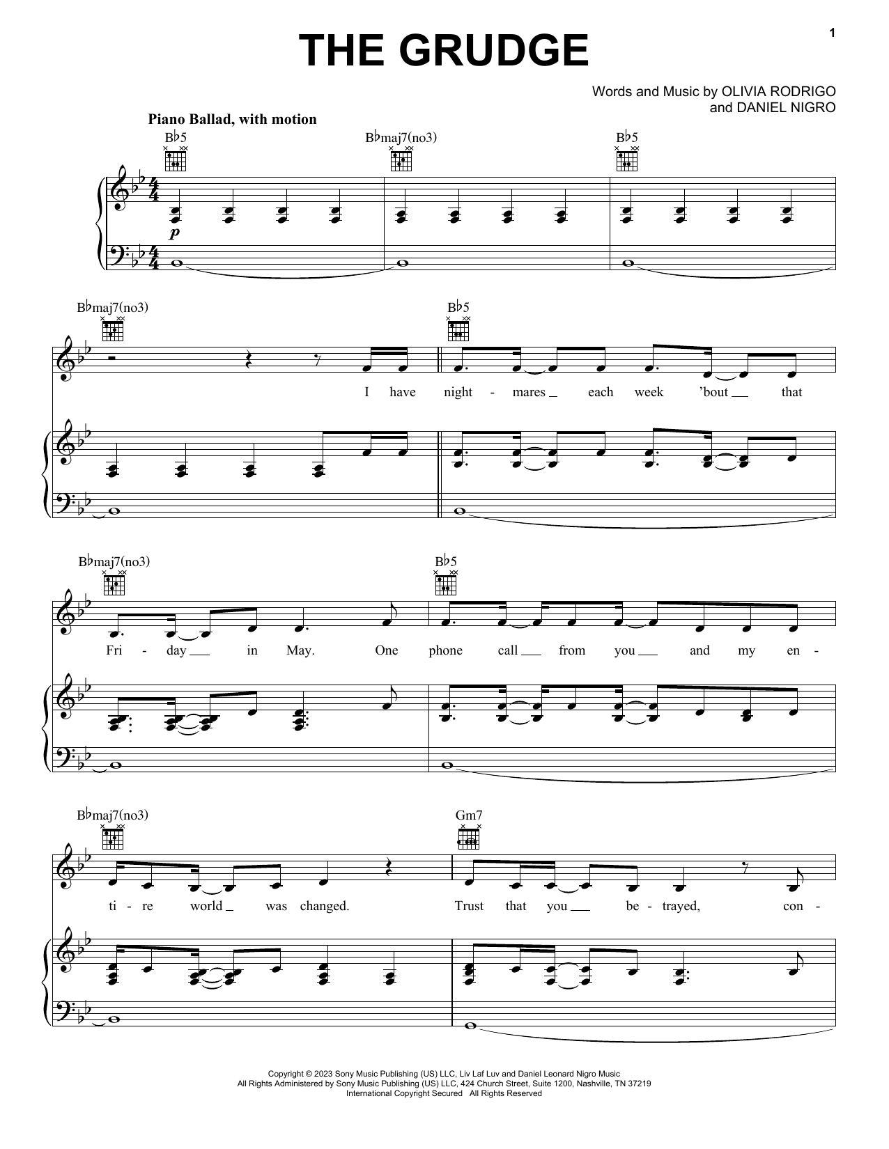 Download or print Olivia Rodrigo the grudge sheet music, chords and digital score arranged for Piano, Vocal & Guitar Chords (Right-Hand Melody). This Pop score includes 9 page(s).