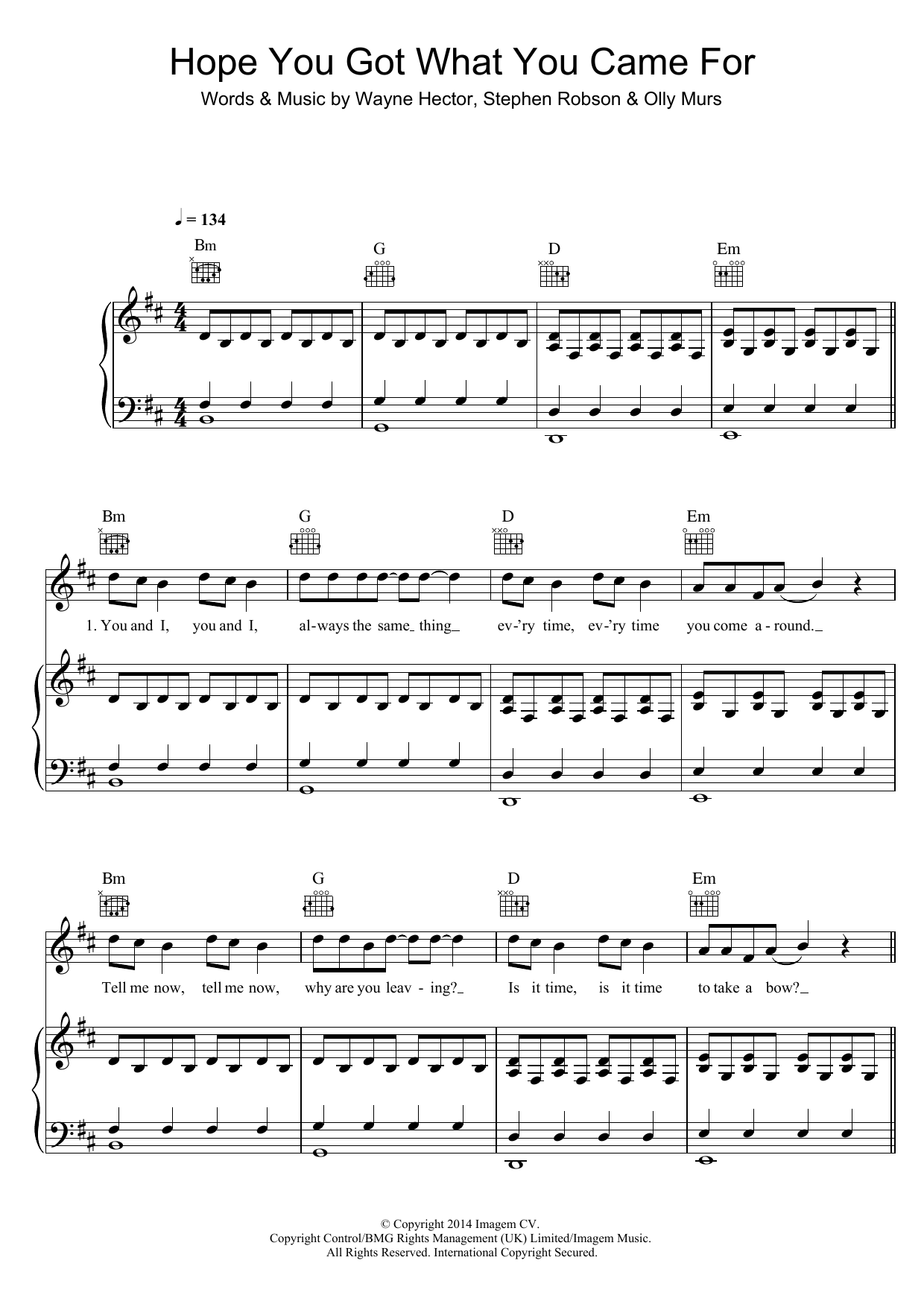 Download or print Olly Murs Hope You Got What You Came For sheet music, chords and digital score arranged for Piano, Vocal & Guitar Chords. This Pop score includes 5 page(s).