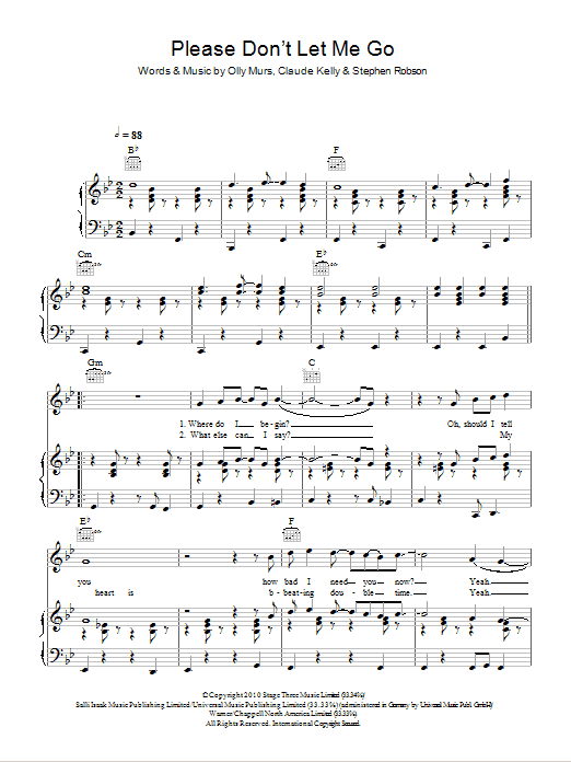 Download or print Olly Murs Please Don't Let Me Go sheet music, chords and digital score arranged for Piano, Vocal & Guitar Chords. This Pop score includes 5 page(s).