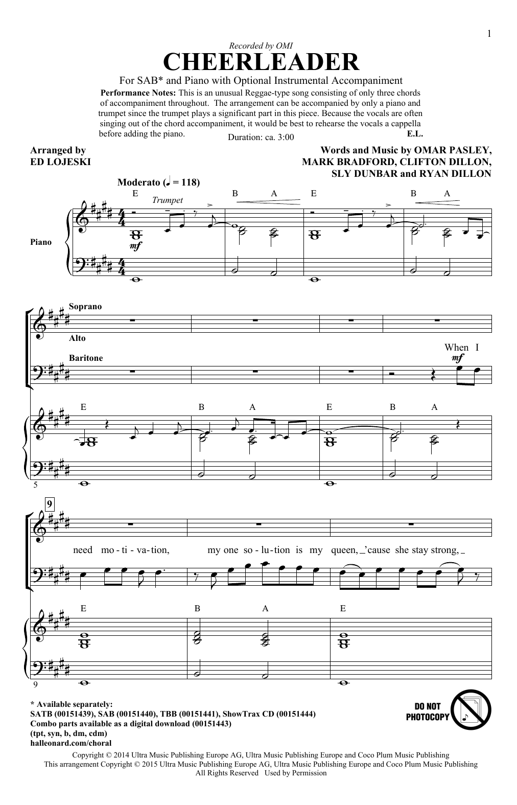 Download or print Omi Cheerleader (arr. Ed Lojeski) sheet music, chords and digital score arranged for SAB Choir. This Pop score includes 11 page(s).
