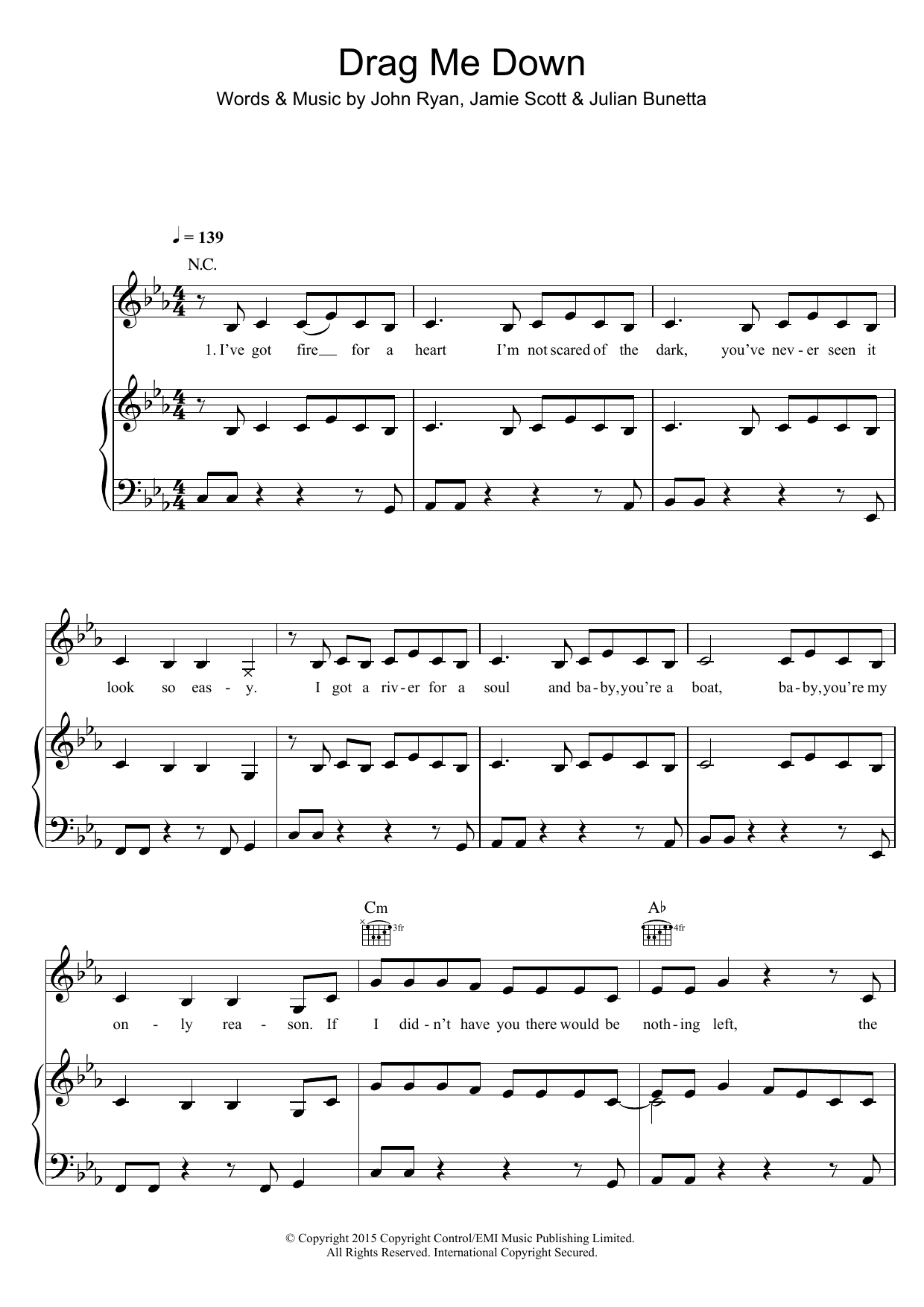 Download or print One Direction Drag Me Down sheet music, chords and digital score arranged for Piano, Vocal & Guitar Chords. This Pop score includes 2 page(s).