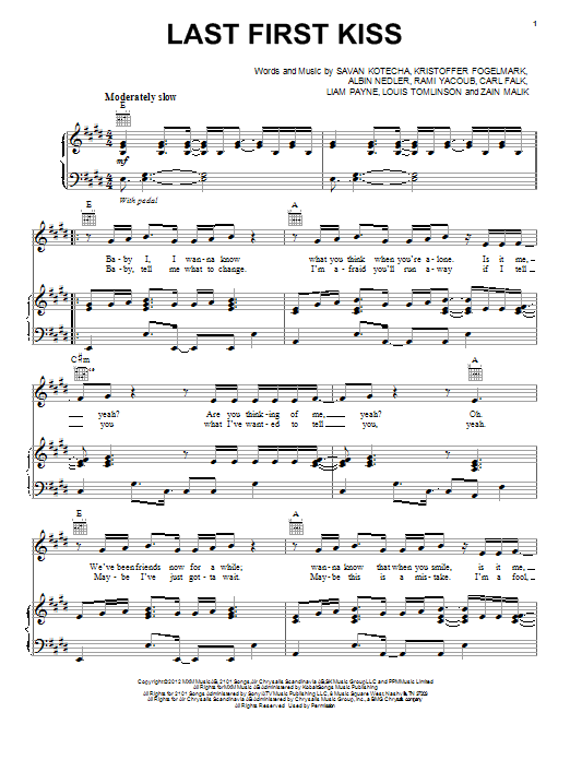Download or print One Direction Last First Kiss sheet music, chords and digital score arranged for Piano, Vocal & Guitar Chords. This Pop score includes 6 page(s).