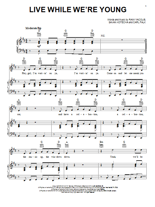 Download or print One Direction Live While We're Young sheet music, chords and digital score arranged for Piano, Vocal & Guitar Chords. This Pop score includes 7 page(s).