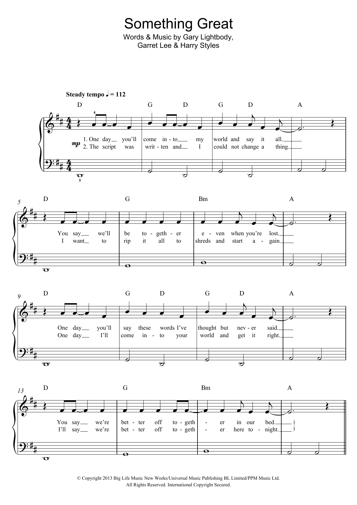 Download or print One Direction Something Great sheet music, chords and digital score arranged for Easy Guitar Tab. This Pop score includes 3 page(s).