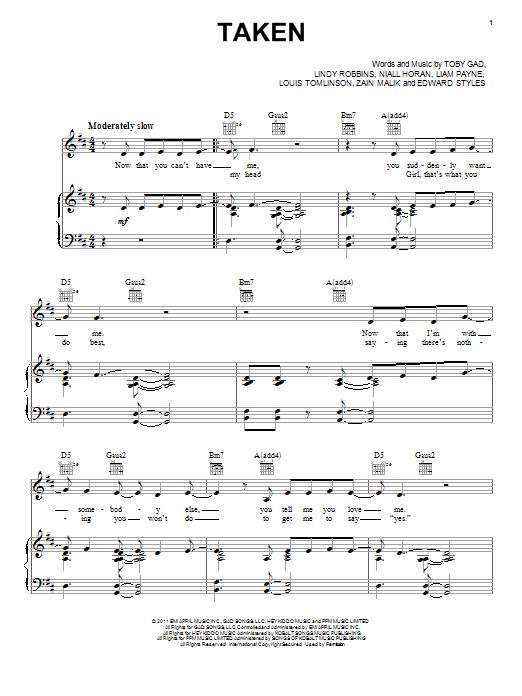 Download or print One Direction Taken sheet music, chords and digital score arranged for Piano, Vocal & Guitar Chords (Right-Hand Melody). This Pop score includes 5 page(s).