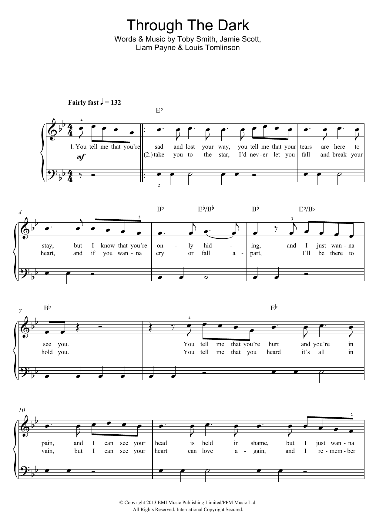 Download or print One Direction Through The Dark sheet music, chords and digital score arranged for Piano, Vocal & Guitar Chords (Right-Hand Melody). This Pop score includes 8 page(s).