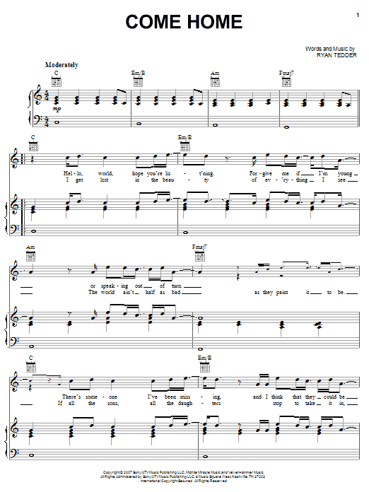 Download or print OneRepublic Come Home sheet music, chords and digital score arranged for Piano, Vocal & Guitar Chords (Right-Hand Melody). This Pop score includes 6 page(s).