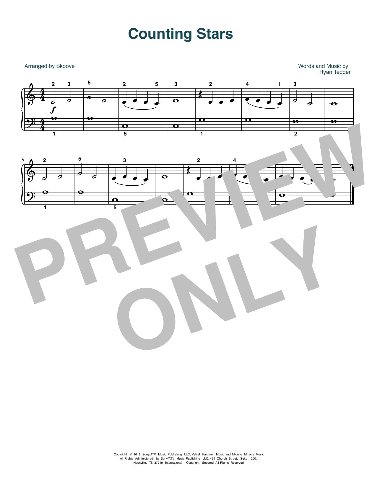 Download or print OneRepublic Counting Stars (arr. Skoove) sheet music, chords and digital score arranged for Beginner Piano (Abridged). This Pop score includes 1 page(s).
