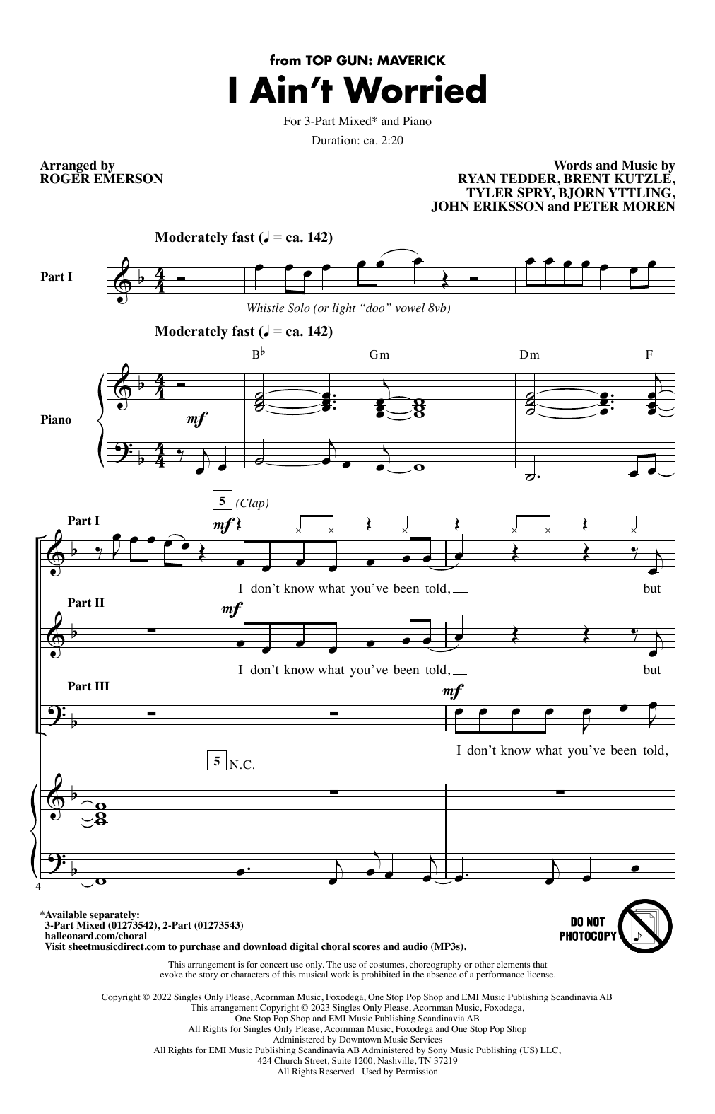 Download or print OneRepublic I Ain't Worried (arr. Roger Emerson) sheet music, chords and digital score arranged for 3-Part Mixed Choir. This Pop score includes 14 page(s).