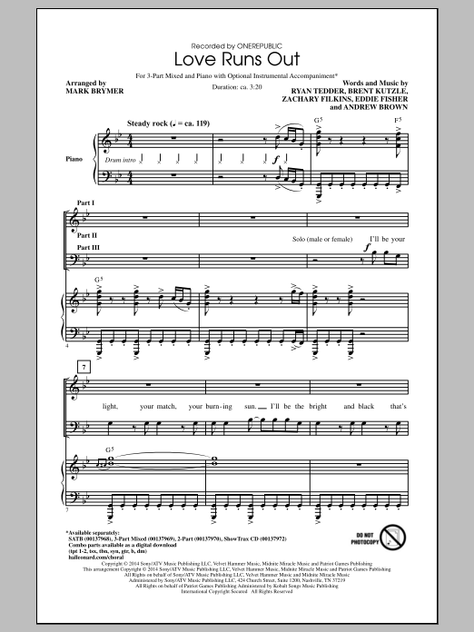 Download or print Mark Brymer Love Runs Out sheet music, chords and digital score arranged for SAB Choir. This Pop score includes 8 page(s).