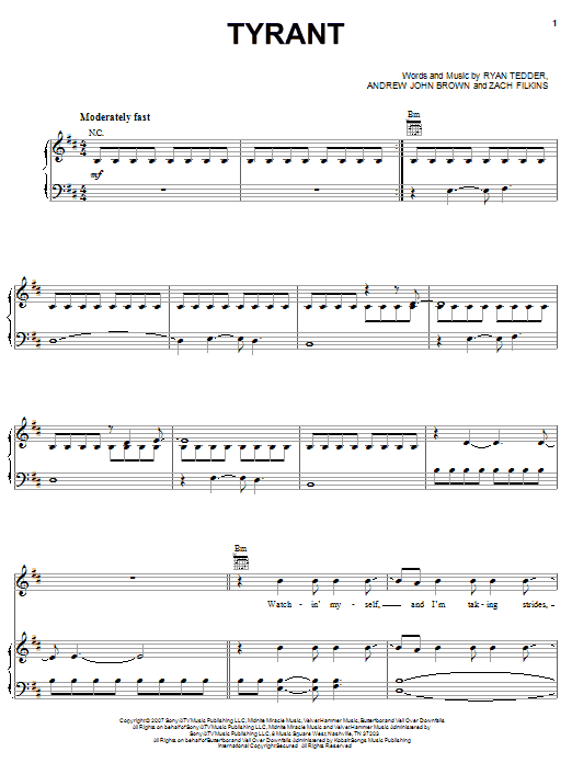 Download or print OneRepublic Tyrant sheet music, chords and digital score arranged for Piano, Vocal & Guitar Chords (Right-Hand Melody). This Film/TV score includes 11 page(s).