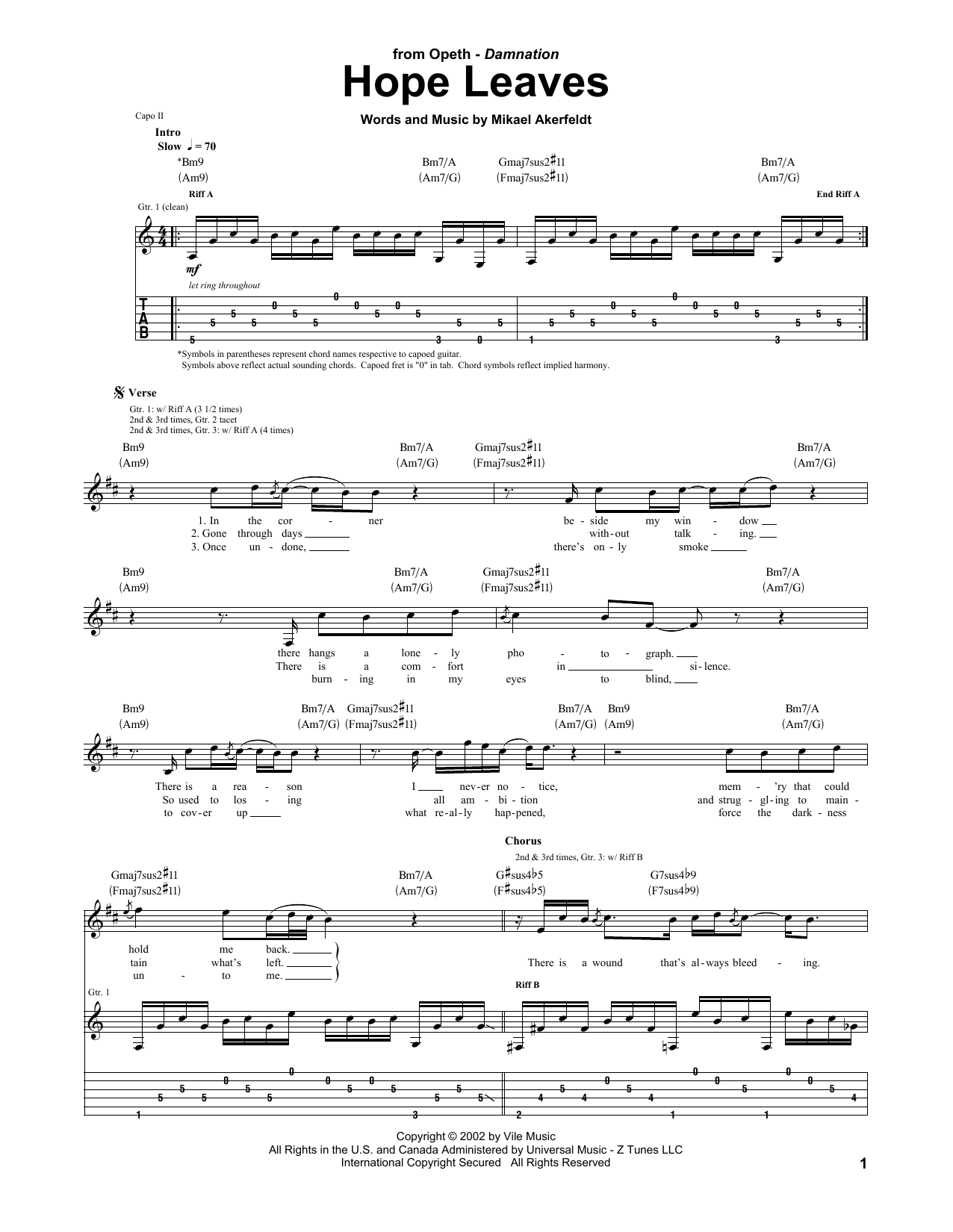 Download or print Opeth Hope Leaves sheet music, chords and digital score arranged for Guitar Tab. This Metal score includes 3 page(s).