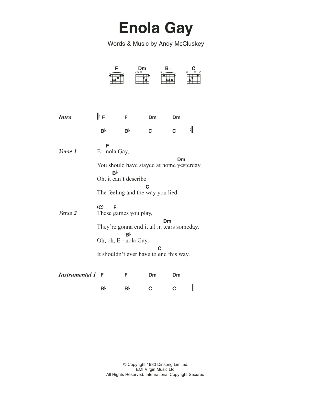 Download or print Orchestral Manouvers in the Dark Enola Gay sheet music, chords and digital score arranged for Guitar Chords/Lyrics. This Pop score includes 3 page(s).