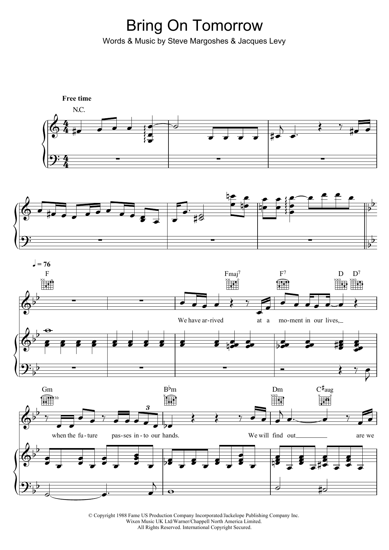 Download or print Original Cast Recording Bring On Tomorrow (from 'Fame') sheet music, chords and digital score arranged for Piano, Vocal & Guitar Chords. This Film/TV score includes 8 page(s).