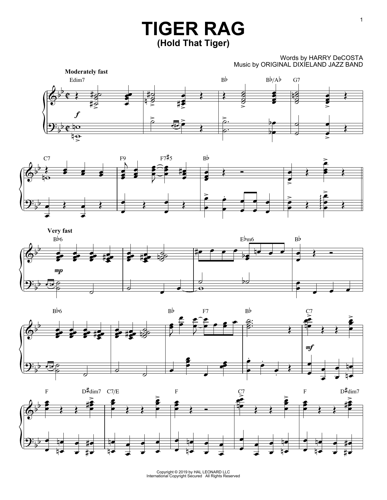 Download or print Original Dixieland Jazz Band Tiger Rag (Hold That Tiger) [Jazz version] sheet music, chords and digital score arranged for Piano Solo. This Jazz score includes 4 page(s).