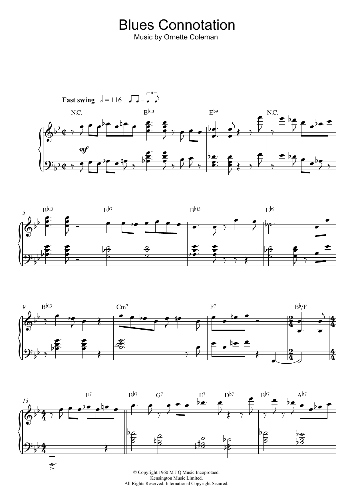 Download or print Ornette Coleman Blues Connotation sheet music, chords and digital score arranged for Piano Solo. This Blues score includes 3 page(s).